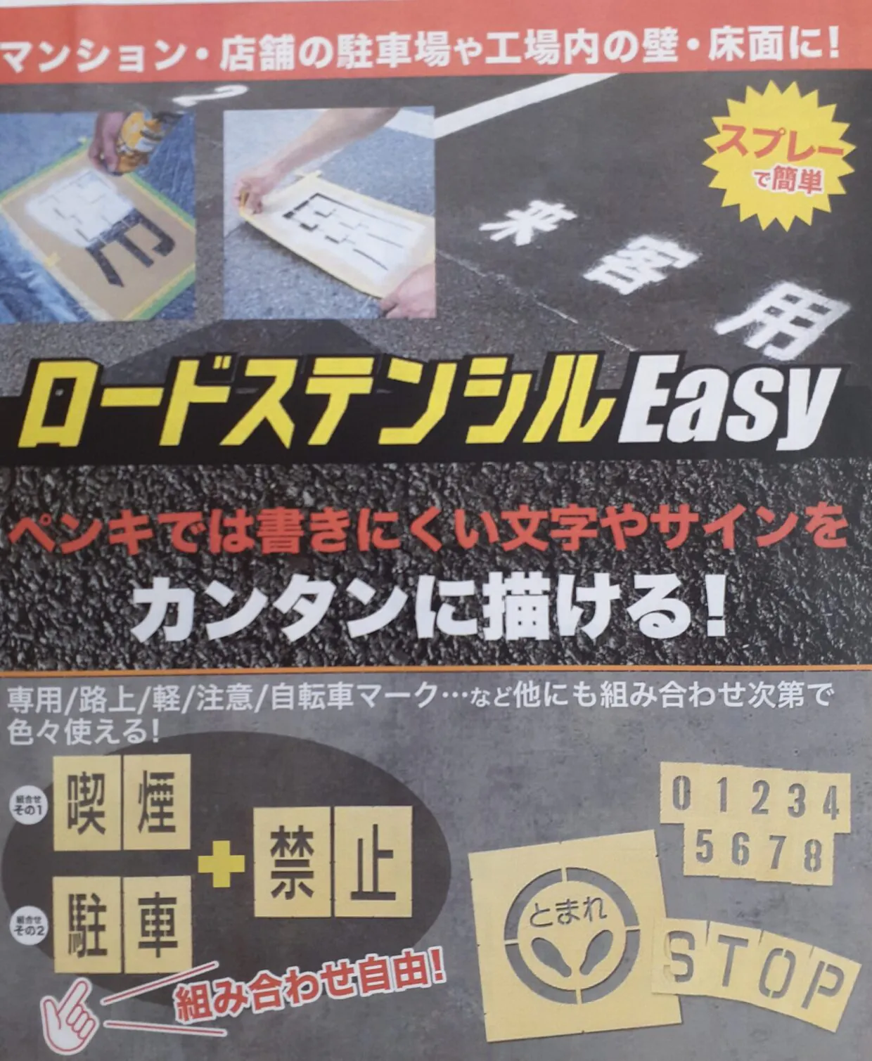 駐車場番号や記号、表示文字を簡単に塗装でき、専用塗料やスプレーと組み合わせることで、はっきりとした標示が可能になります。