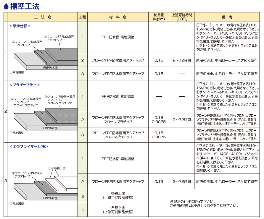 - FRP防水面専用: FRP防水層の耐久性を向上させ、改修でも使用可能